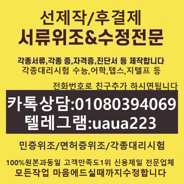 [제작위조]합격증명서제작=토익대리시험→톡상담친추+01080394069텔레uaua223학위증제작&학위증위조#토익대리시험&서류제작&포토샵&민증제작&외국인등록증제작&국제운전면허증위조