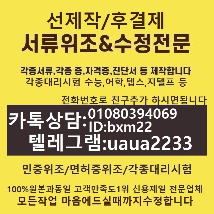 이전글 [제작위조]대학교졸업증명서제작#편입대리시험→톡ID:bxm22&톡친추01080394069텔레uaua2233고용보험자격이력내역서위조#진단서위조#인적성검사대리시험#미성년자쯩#구청위조#재직증명서위조#민증위조#제적증명서위조
