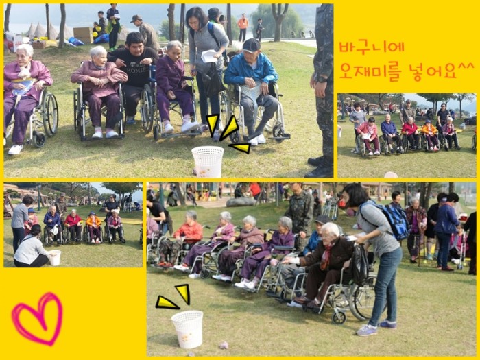 ▲▲▲ 바구니에 안에 오재미를 던지는 게임이에요^^ 실수도 있고 망설임도 많았지만~~ 어르신들 모두 열심히 하려는 모습만큼은 으뜸이었던 시간이었습니다.. ^^