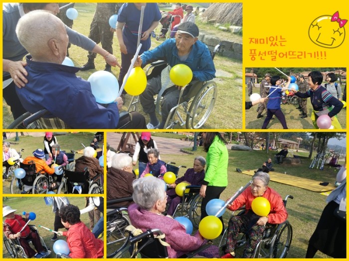 ▲▲▲ 이번에는 양손에 달린 풍선을 신문지칼로 떨어뜨리는 게임이에요^^ 시작소리와 함께 여기저기서 들리는 기쁨과 아쉬움의 소리들!!! ^^ 선의의 경쟁이었지만 그속에서 피어나는 열정과 행복!! 그리고 함께한다는 마음!!! 어르신들 모두 입가에 미소를 짓게 했던 시간이었습니다.