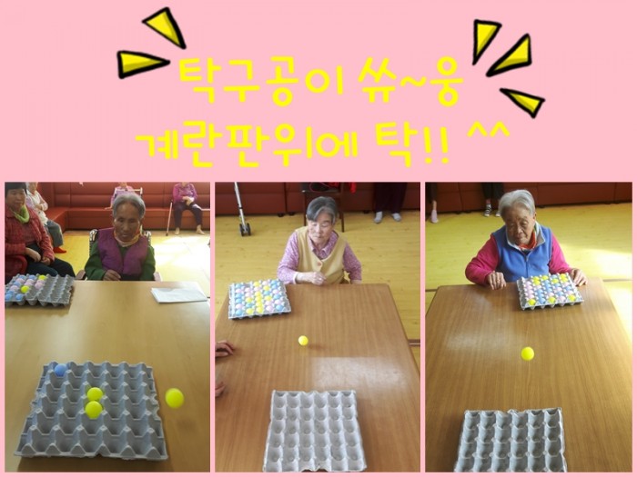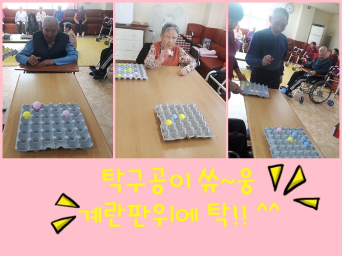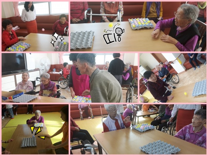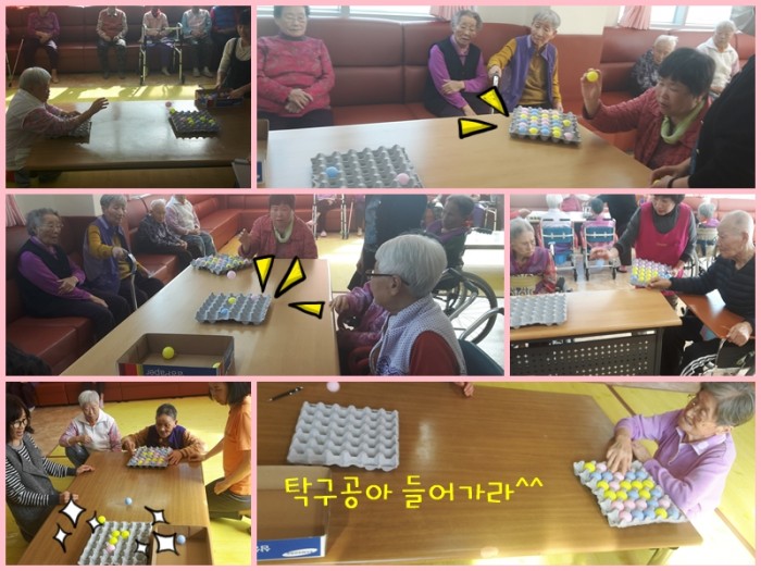 어르신들과 함께 계란판에 탁구공 넣기 게임을 했어요^^