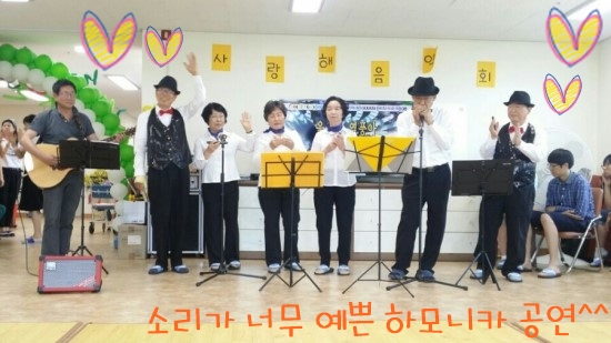 ▲▲▲ 이번에는 소리가 너무 예쁜 하모니카 공연 모습이에요... ^^ 손인엽 선생님과 함께 하모니카 연주를 위해 많은 준비를 해주신 노인복지관 하모니카 동호회 선생님들^^ 어르신들께서 좋아하는 노래들만 선곡해서 아름다운 멜로디를 들려주셨습니다. 정말 앵콜이 계속 나올정도로 인기가 대단했습니다.. ^^