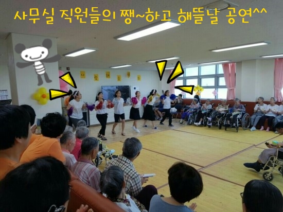 ▲▲▲ 사무실 직원들의 공연 모습이에요^^ '해뜰날' 노래에 맞춰 안무를 준비해봤습니다. 연습할때는 자연스럽게 몸이 움직여줬는데 막상 실전에서는 왜그렇게 몸치가 되던지요!!! ^^ 조금 더 잘하지 못한게 아쉬울정도에요!! 그래도 어르신들께서 잘했다며 박수를 치며 응원해주시는 모습에 다시한번 감동을 받았습니다.. ^^