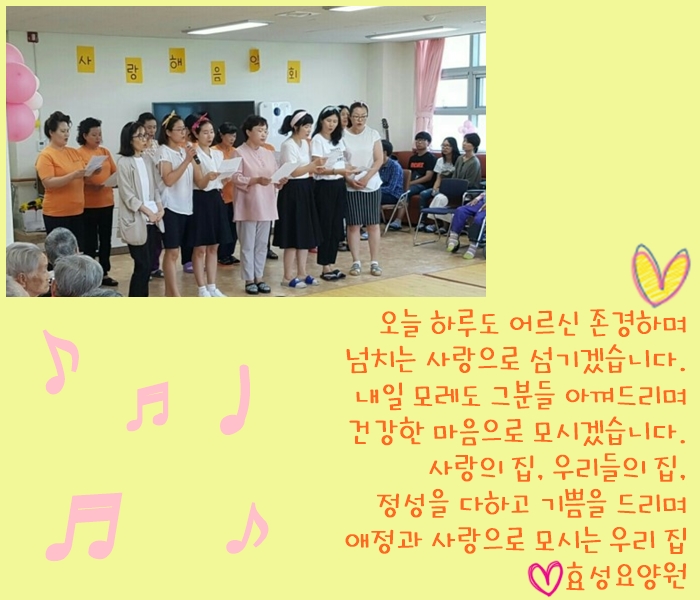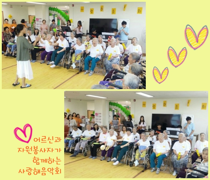 2016년 6월 25일 토요일!! 오후 2시!!! ^^ 6개월동안 진행되었던 특화프로그램<사랑해음악회>이 대단원의 막을 내렸습니다. <사랑해음악회> 공연을 위해 이날은 특별히 어르신들의 연주공연과 사무실직원들의 공연, 요양보호사팀의 공연, 하모니카 공연, 아코디언 공연 등~ 다양한 공연들이 그 빛을 발하는 시간이었습니다.
