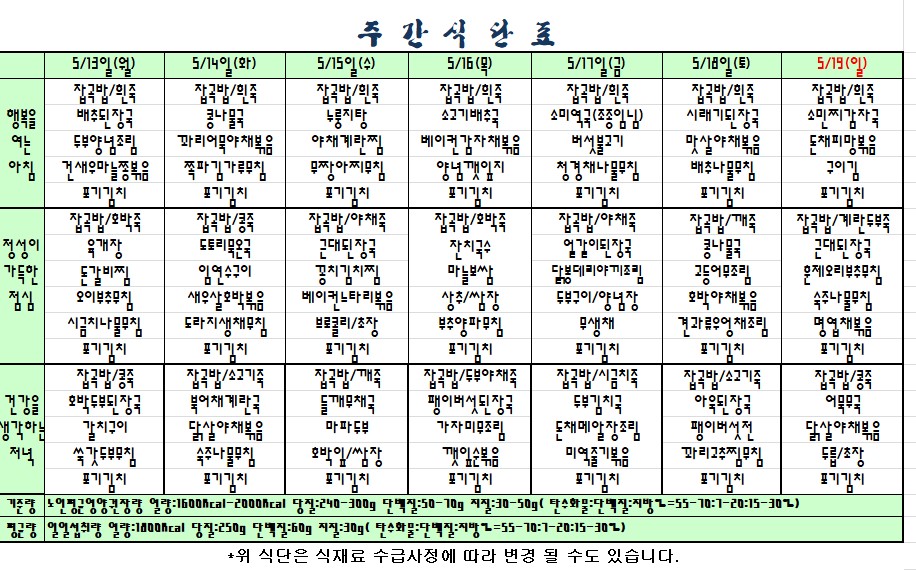 | 2019.05.13~05.19 주간식단표 관리자2019-05-13조회수 3639 |