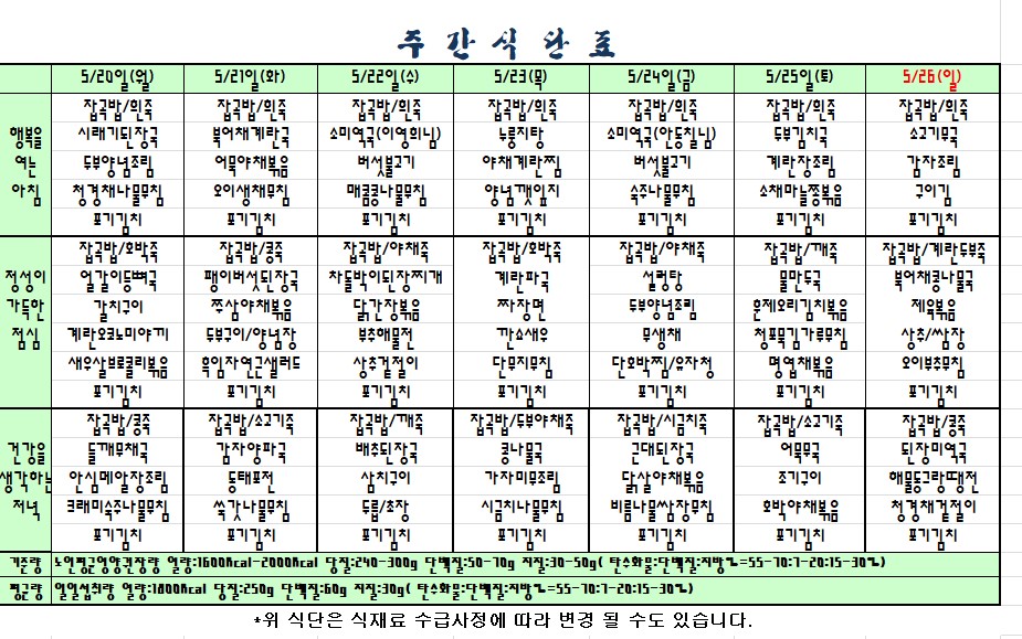 | 2019.05.20~05.26 주간식단표 관리자2019-05-17조회수 3627 |