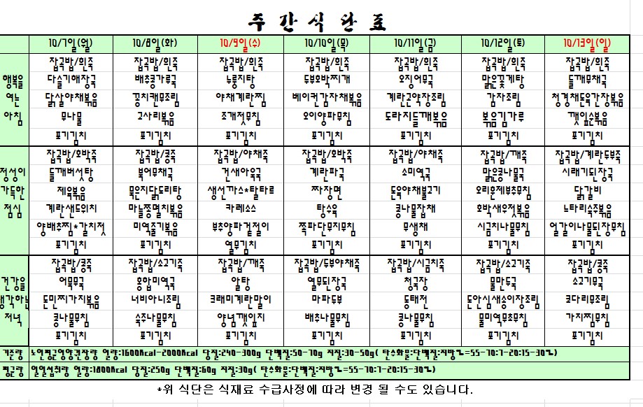 | 2019.10.07~10.13 주간식단표 관리자2019-10-04조회수 3579 |