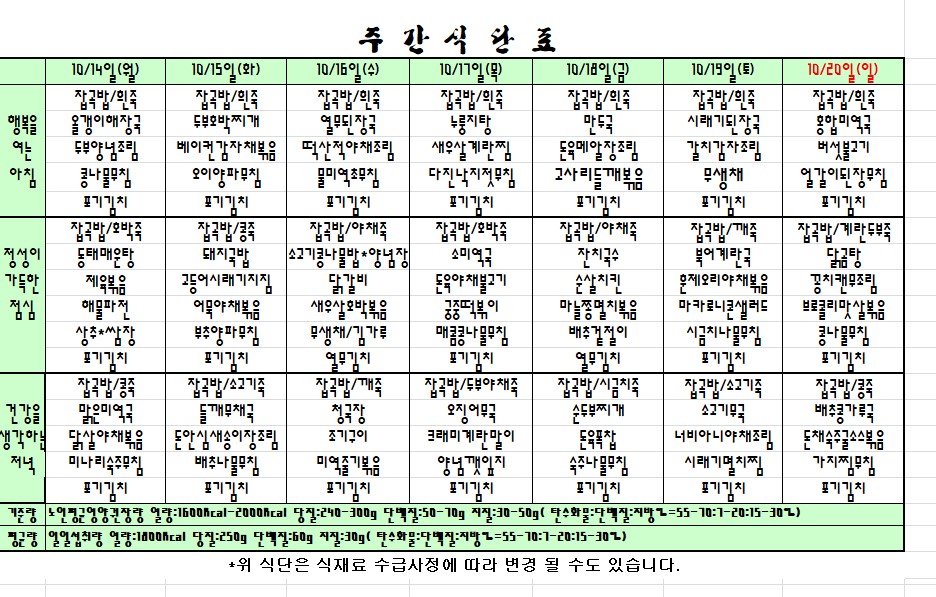| 2019.10.14~10.20 주간식단표 관리자2019-10-11조회수 3553 |