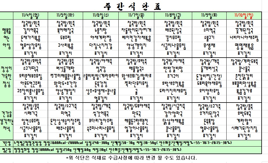 | 2019.11.04~11.10 주간식단표 관리자2019-11-01조회수 3560 |