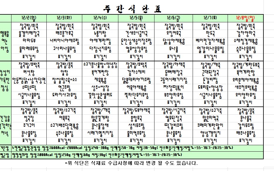 | 2019.12.02~12.08 주간식단표 관리자2019-12-09조회수 3545 |