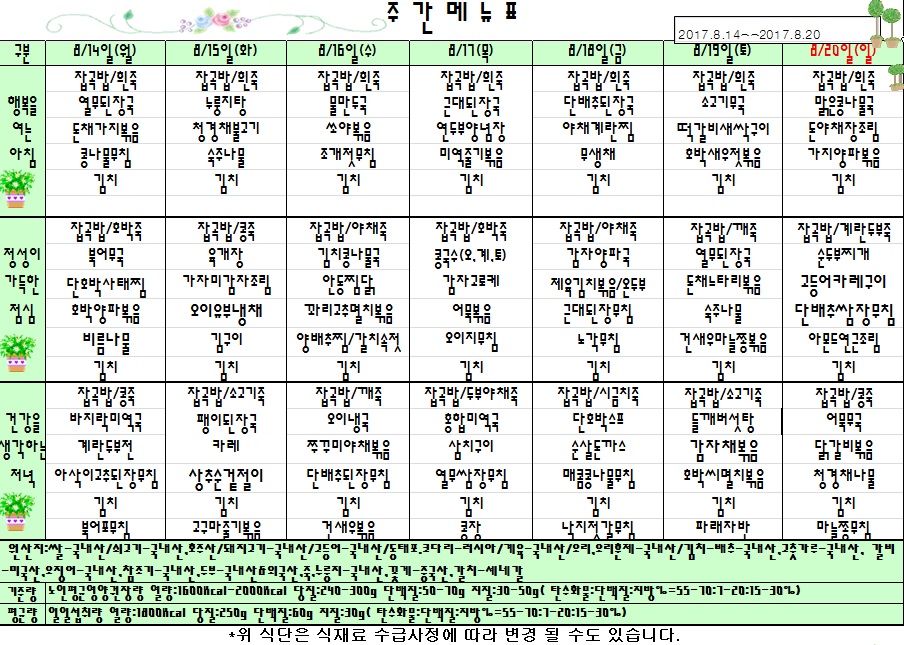 | 2017년 8월 14일 ~ 8월 20일 식단표 관리자2017-08-11조회수 3455 |