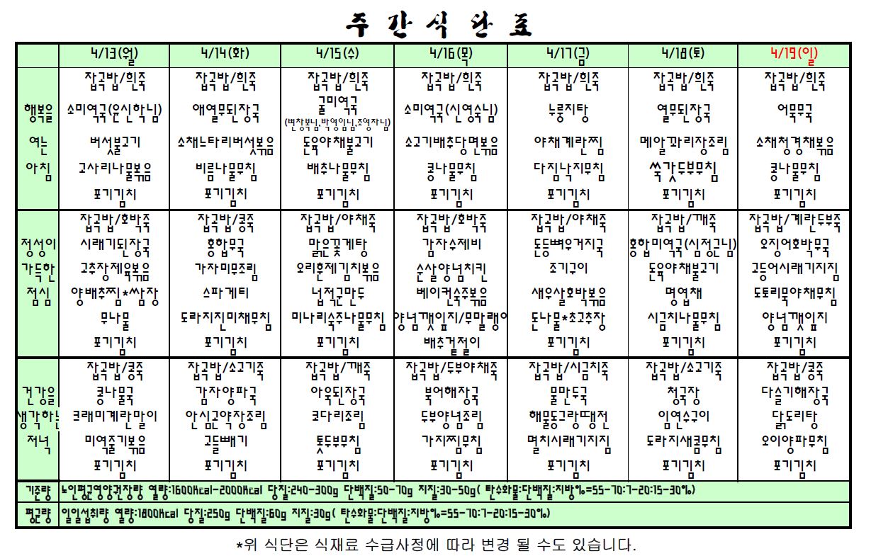 | 2020.04.13~04.19 주간식단표 관리자2020-04-10조회수 3577 |