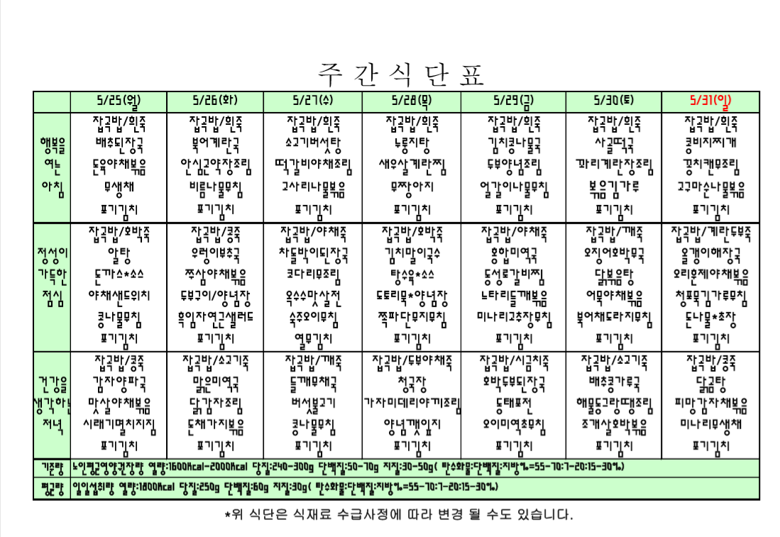 주간식단표 입니다. |