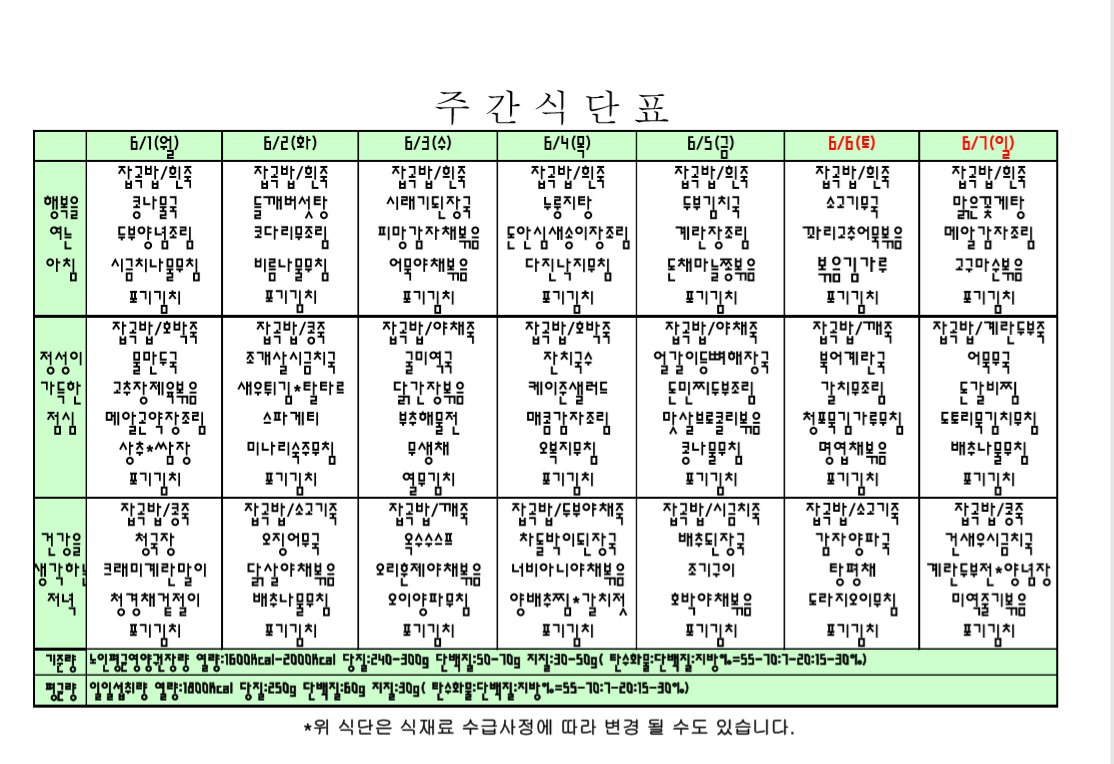 6월 첫주 주간식단표 입니다. |