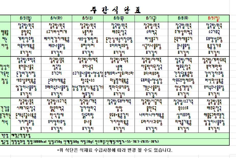 2020.08.03 ~08.09 주간식단표 식단표입니다. |