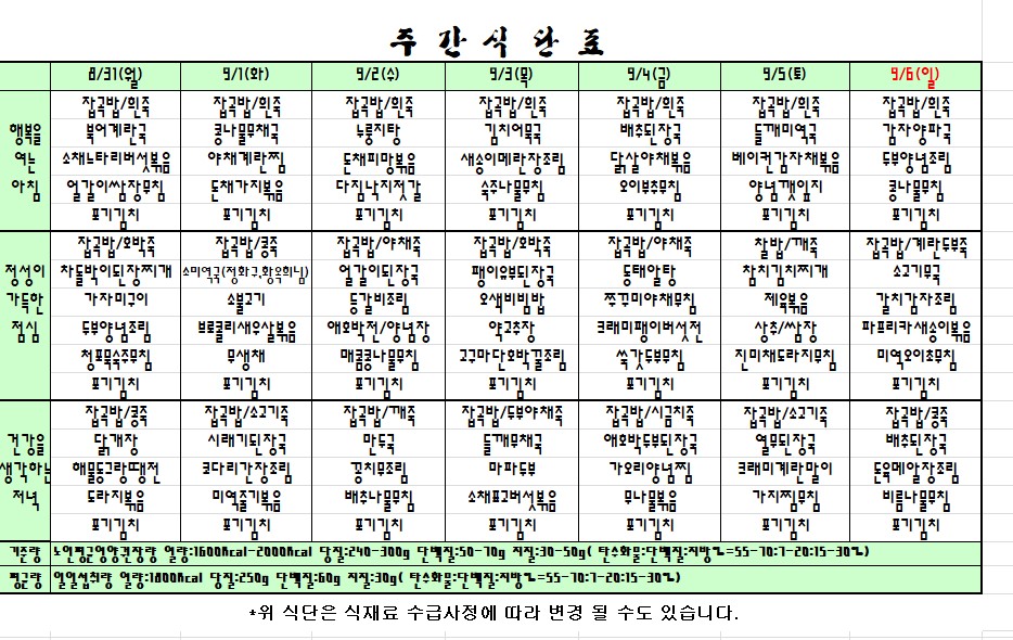 2020.08. 31~09. 06 주간식단표입니다. |