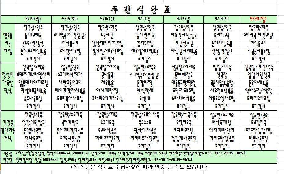 2020. 09. 14 ~ 20. 주간식단표 입니다. |