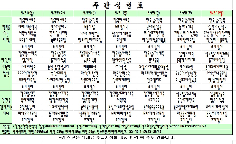 2020. 09. 21 ~ 09. 27. 주간식단표 입니다.