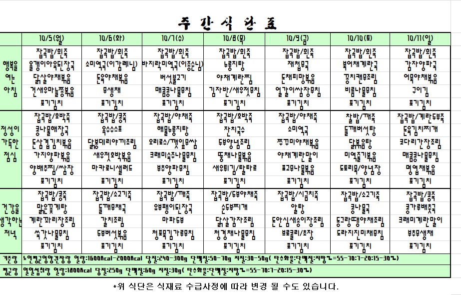 2020. 10. 05 ~ 10. 11. 주간식단표 입니다. |