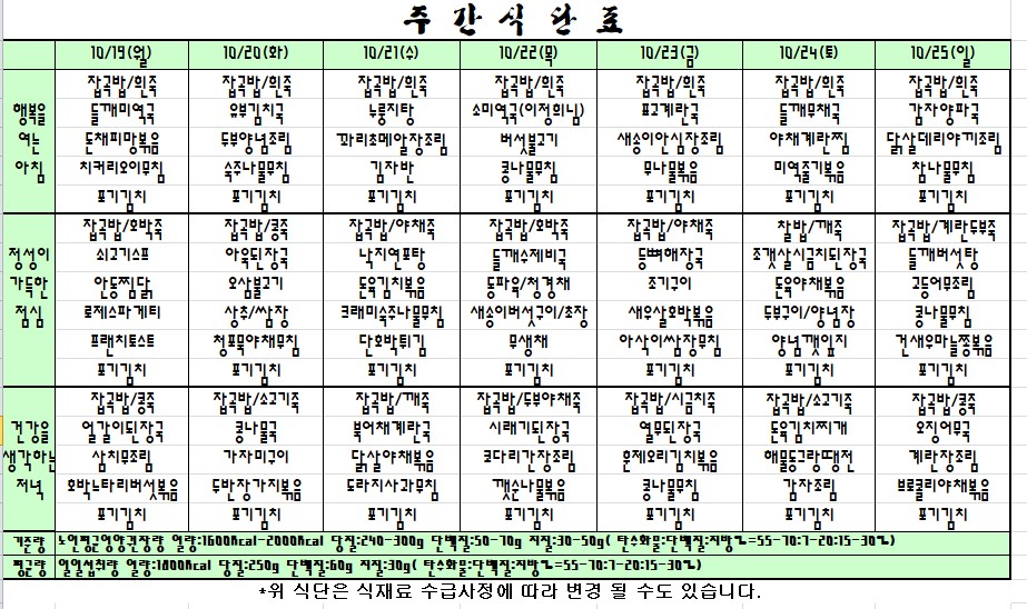20. 10. 19~10. 25 주간식단표 입니다. |
