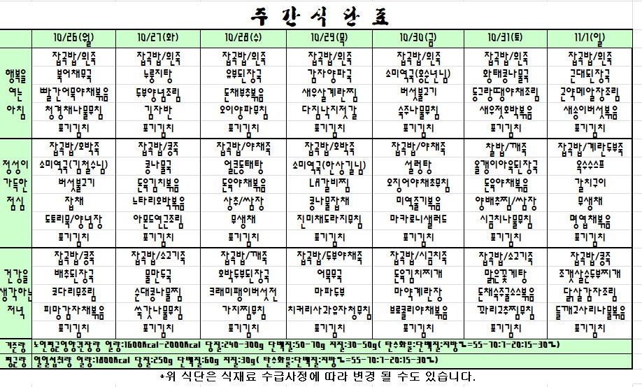 20. 10. 26~11. 01 주간식단표 입니다. |