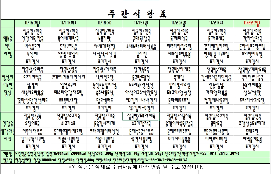 20. 11. 16 ~11. 22 주간식단표 입니다. |