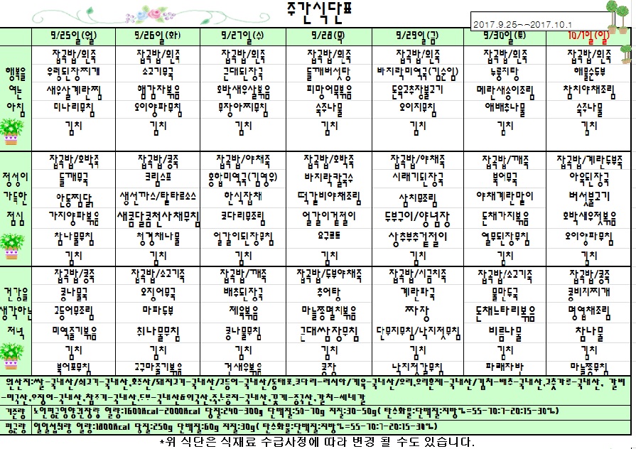| 2017년 9월 25일 ~ 10월 1일 식단표 관리자2017-09-25조회수 3538 |