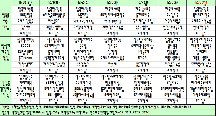 2020. 11. 30 ~ 12. 06 주간식단표 입니다. |