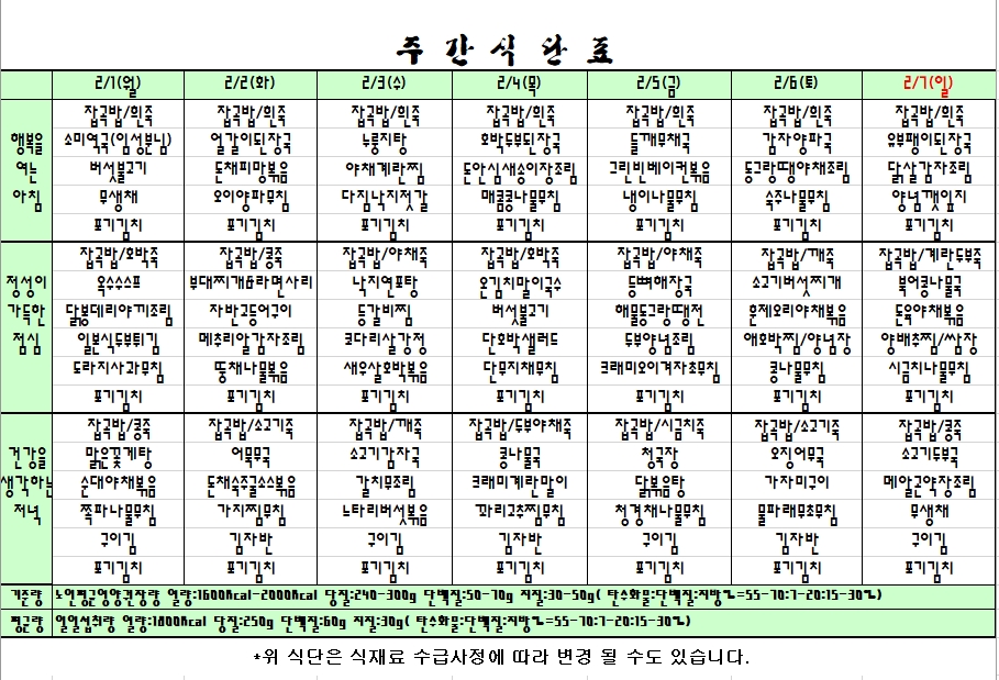 2021. 02. 01 ~ 02. 07. 주간식단표