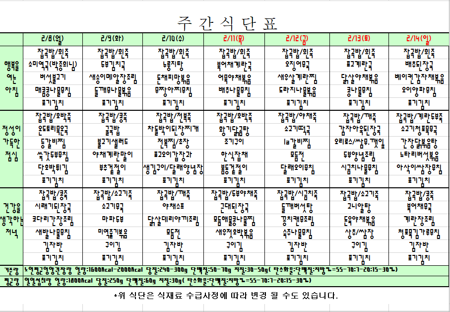 2021. 02. 08 ~ 02. 14. 주간식단표 |
