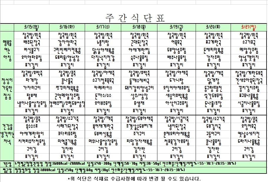 21. 03. 15 ~ 03. 21 주간식단표입니다. |