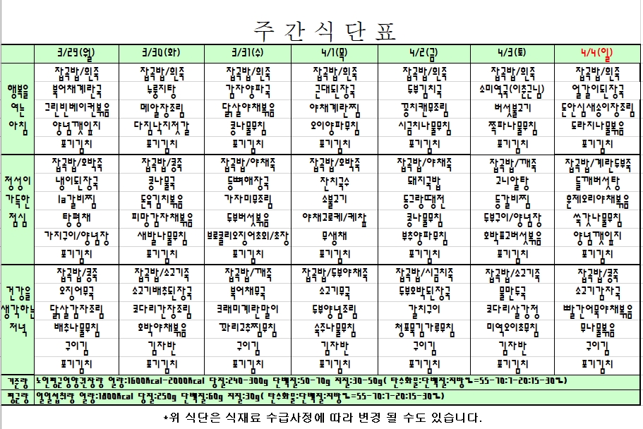 2021. .03. 29 ~ 04. 04 주간식단표