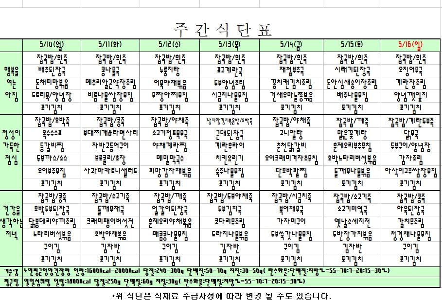 2021. 05. 10 ~ 05. 16  주간식단표 입니다.