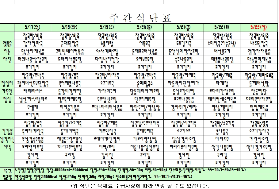 2021. 05. 17 ~ 05. 23  주간식단표 입니다.