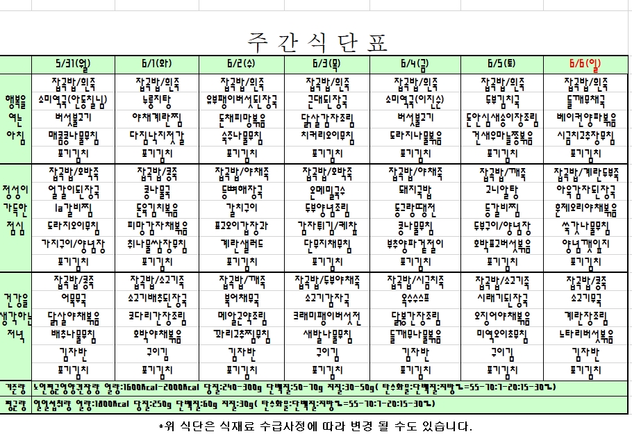 2021. 05. 31 ~ 06. 06  주간식단표 입니다.