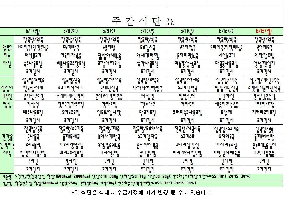 2021. 06. 07 ~ 06. 13 주간식단표
