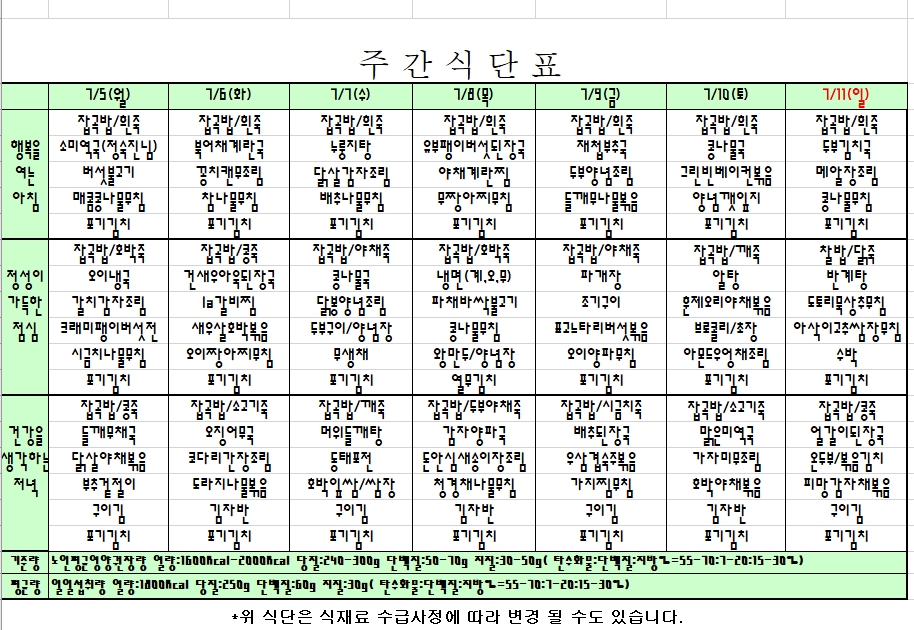 2021. 07. 05 ~ 07. 11  주간식단표 입니다.
