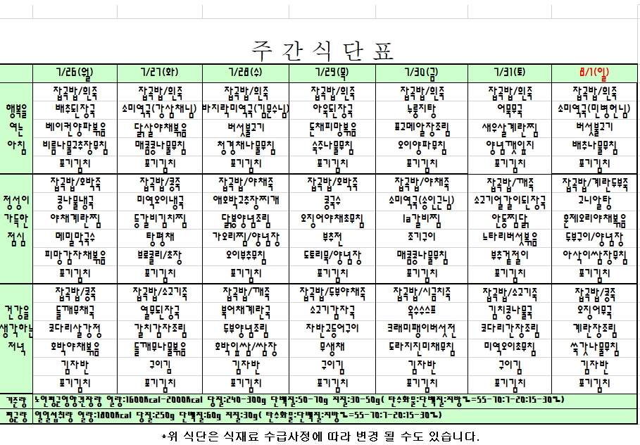 2021. 07. 26 ~ 08. 01  주간식단표 입니다.