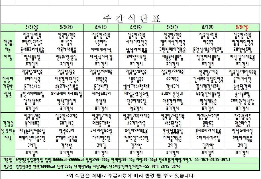 2021. 08. 02 ~ 08. 08  주간식단표 입니다.