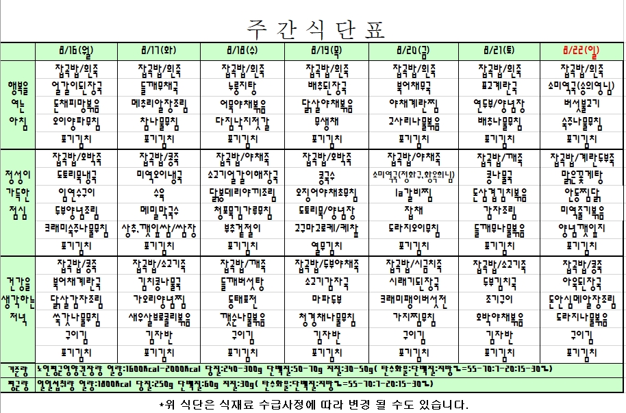 2021. 08. 16 ~ 08. 22 주간식단표입니다. |