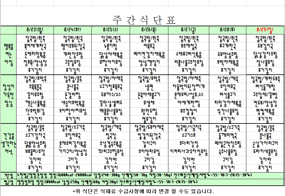 2021. 08. 23 ~ 08. 29 주간식단표입니다. |