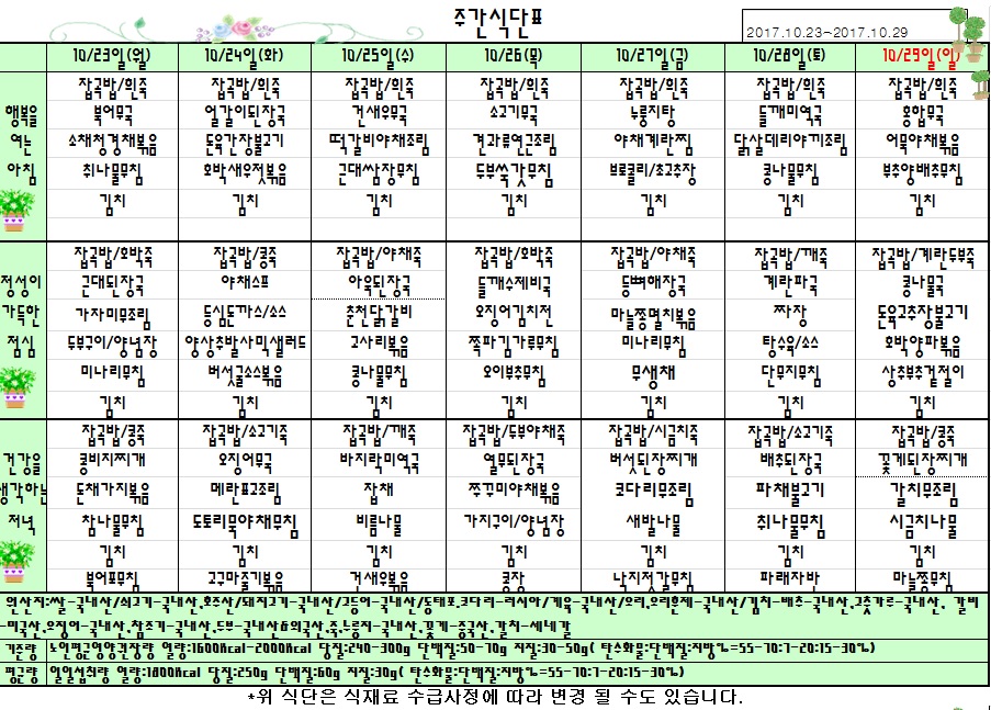 | 2017년 10월 23일 ~ 29일 식단표 관리자2017-10-24조회수 3463 |