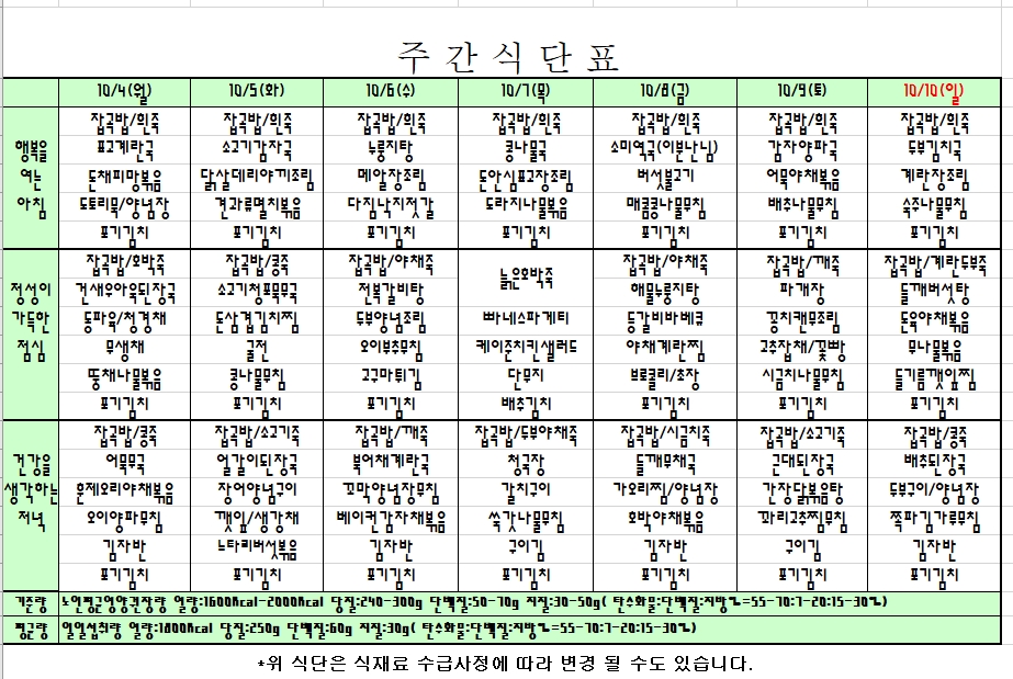 2021. 10. 04 ~ 10. 10 주간식단표