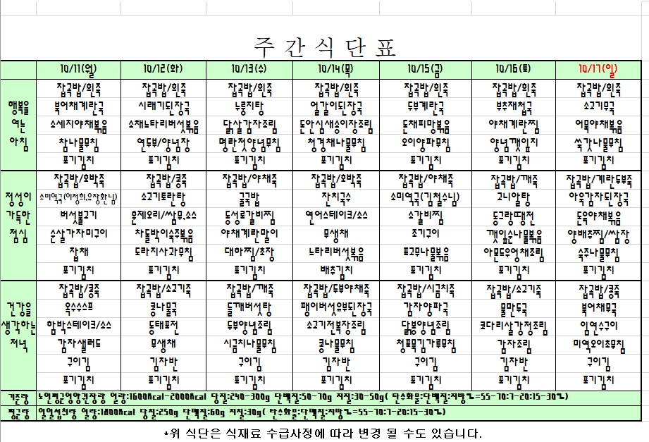 2021. 10. 11 ~ 10. 17  주간식단표 입니다.