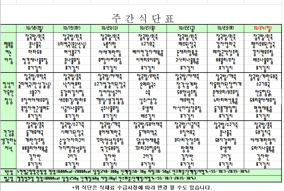 2021. 10. 18 ~ 10. 24 주간식단표입니다. |