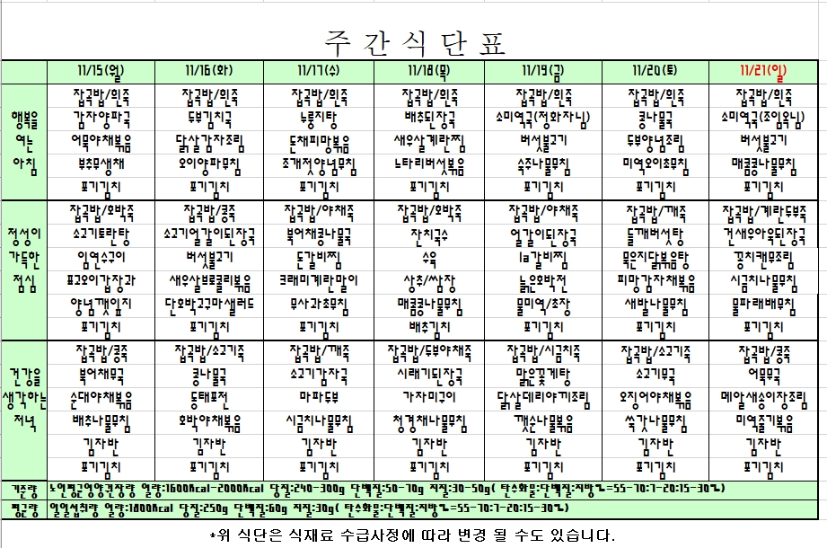 2021. 11. 15 ~ 11. 21 주간식단표입니다. |
