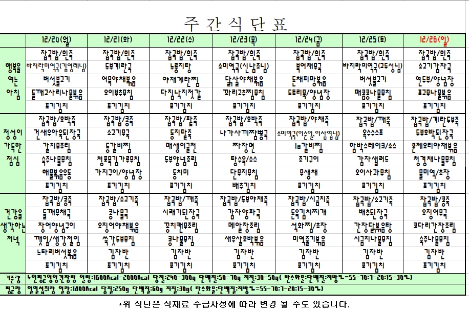 2021. 12. 20 ~ 12. 26  주간식단표 입니다.