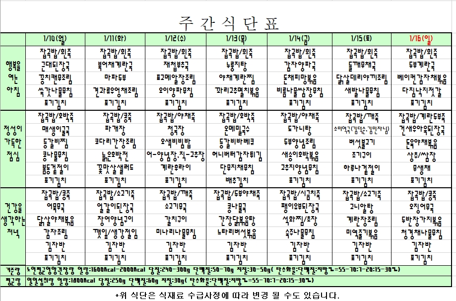 | 2022. 01. 10 ~ 01. 16 주간식단표 관리자2022-01-06조회수 2949 |