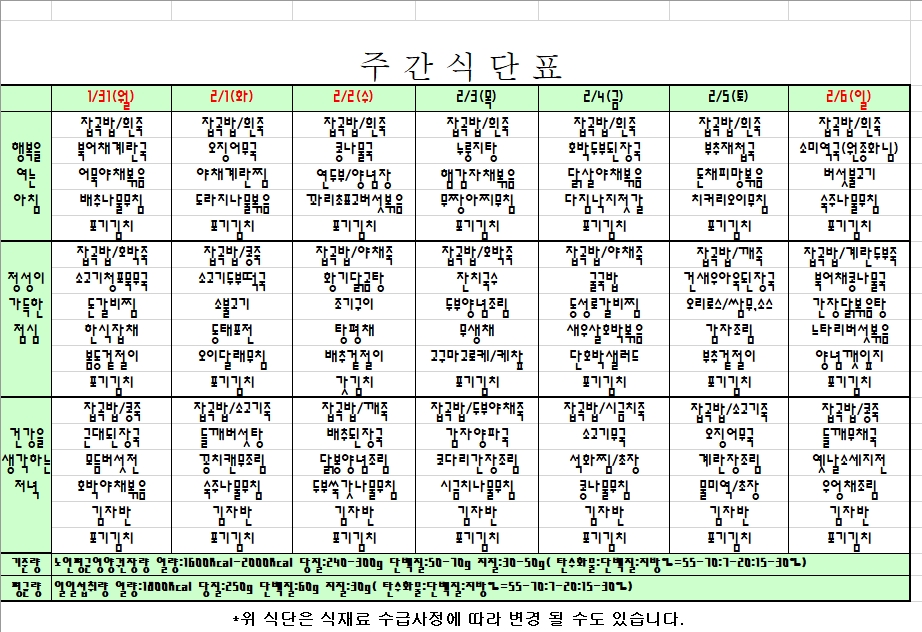 2022. 01. 31 ~ 02. 06 주간식단표