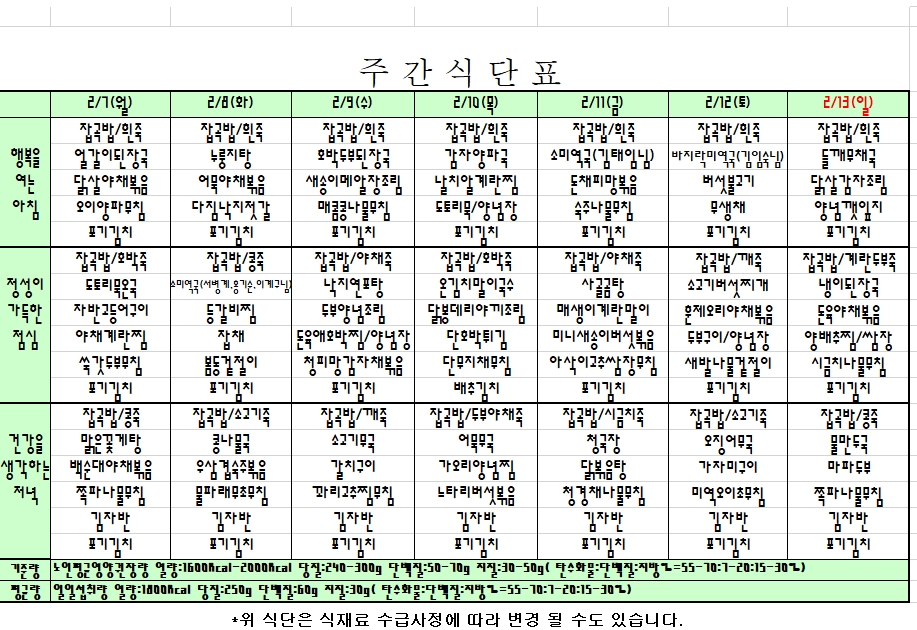 2022. 02. 07 ~ 02. 13  주간식단표 입니다.